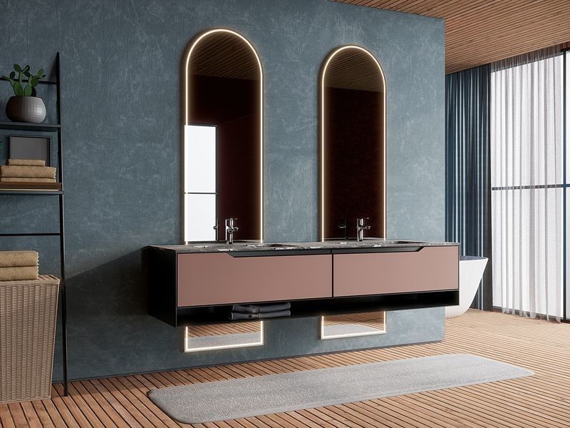 Bu banyo boşluğu, genel bir SKU yerine tasarım yönlendirilen bir sistem olarak sunuluyor.Premium paslanmaz çelik dolap yapısı ile birlikte kontrol edilen bir bitiş paleti kullanır, bu da premium konut projeleri için daha çözülmüş bir görsel kimlik yaratır.