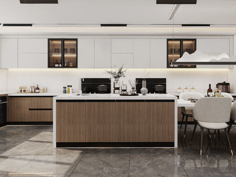 Bu özel mutfak dolabı farklı bir bitiş stratejisi etrafında inşa edilmiştir: Ahşap Taneler / Beyaz Premium paslanmaz çelik dolabı yapısı ile eşleştirilmiştir.Bu kombinasyon alıcılara paslanmaz çelik dolaplardan beklenen temizleme kabiliyetini ve proje dayanıklılığını kaybetmeden daha sıcak bir lüks ifadesi verir.