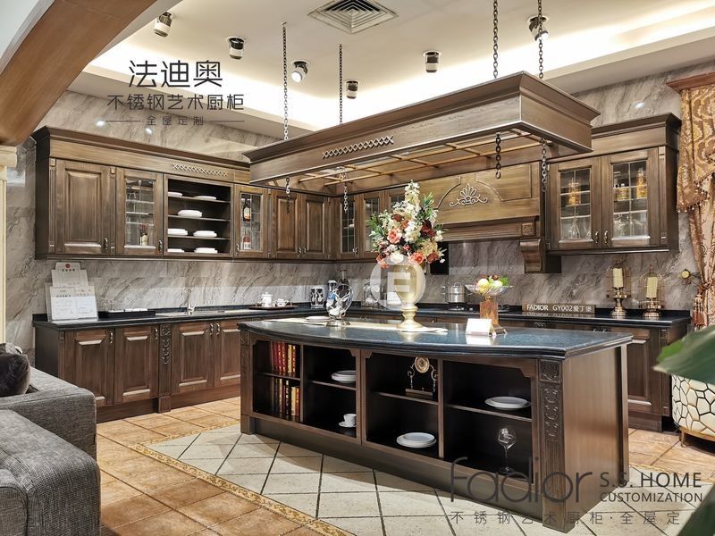 Bu özel mutfak dolabı farklı bir sonlandırma stratejisi etrafında inşa edilmiştir: Koyu ahşap sonlandırma paslanmaz çelik tonları ile, geleneksel estetiği modern dayanıklılıkla birleştirir.paslanmaz çelik kabine yapısı ile eşleştirilmişBu kombinasyon alıcılara paslanmaz çelik dolaplardan beklenen temizleme kabiliyetini ve proje dayanıklılığını kaybetmeden daha sıcak bir lüks ifadesi verir.