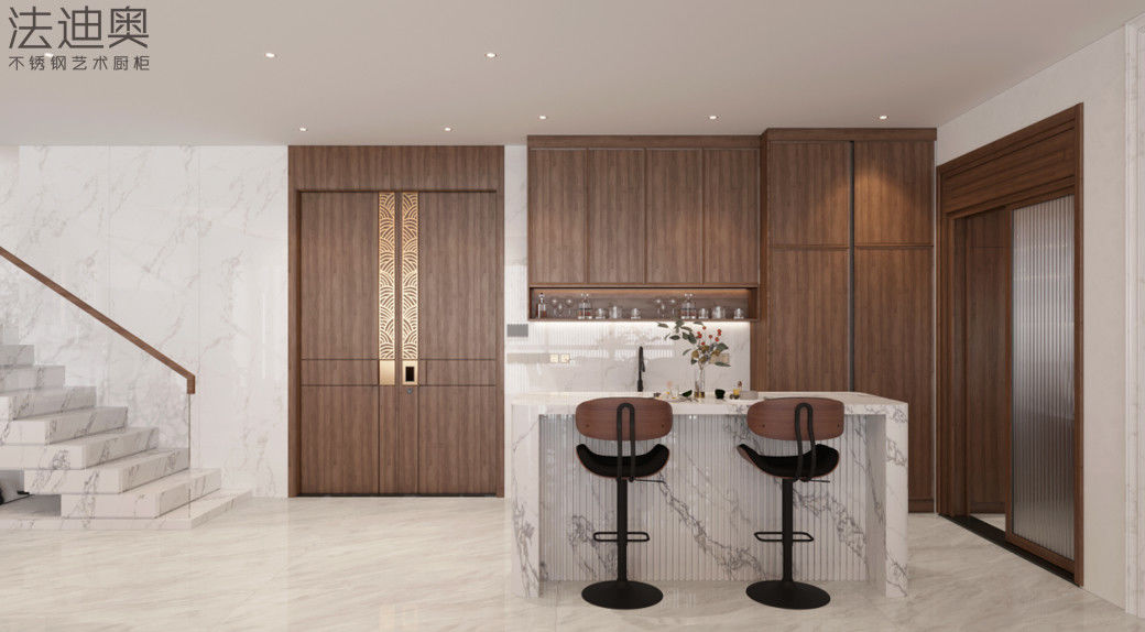 Bu özel mutfak dolabı farklı bir bitirme stratejisi etrafında inşa edilmiştir: Ahşap Taneler Premium paslanmaz çelik dolabı yapısı ile eşleştirilmiştir.Bu kombinasyon alıcılara paslanmaz çelik dolaplardan beklenen temizleme kabiliyetini ve proje dayanıklılığını kaybetmeden daha sıcak bir lüks ifadesi verir.
