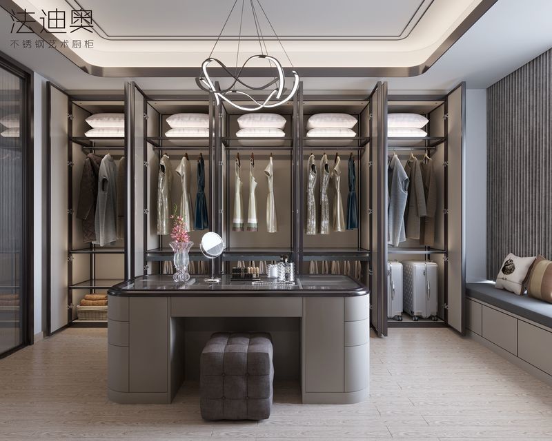 Bu gardırop, genel bir SKU yerine tasarım odaklı bir sistem olarak sunulmaktadır.Premium paslanmaz çelik dolap yapısı ile birlikte kontrol edilen bir bitiş paleti kullanır, bu da premium konut projeleri için daha çözülmüş bir görsel kimlik yaratır.