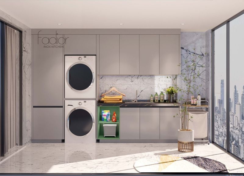 | Yüksek Kabine | Çamaşır makinesi-kurutma makinesi kombinasyonunun yan tarafında, zeminden tavana kadar uzanan yüksek bir dolap bulunur ve ek depolama imkanı sağlar. |