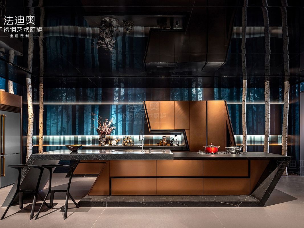 Bu özel mutfak dolabı farklı bir bitirme stratejisi etrafında inşa edilmiştir: Paslanmaz çelik dolabı yapısı ile eşleştirilen Gül Altın.Bu kombinasyon alıcılara paslanmaz çelik dolaplardan beklenen temizleme kabiliyetini ve proje dayanıklılığını kaybetmeden daha sıcak bir lüks ifadesi verir.