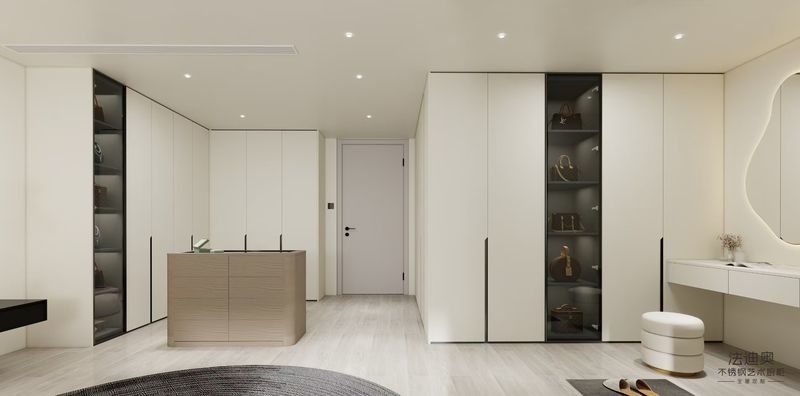 Aynı zamanda projede hazır bir düzenlemeyi, giysileri, aksesuarları ve lüks eşyaları düzenlemek için mükemmel olan entegre raflar ve cam ekran birimleri ile çok bölümlü gardırop düzeniyle birleştirir.Alıcıların hikayenin bitip bitmediğini anlamasına yardımcı olmak., cihaz entegrasyonu ve günlük kullanım planlaması tek bir sistemde uyumlu kalabilir.