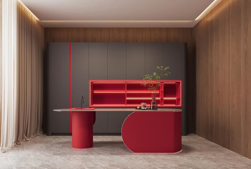 | Renk | Vurgular: Mat siyah dolaplar + parlak kırmızı açık raflar |