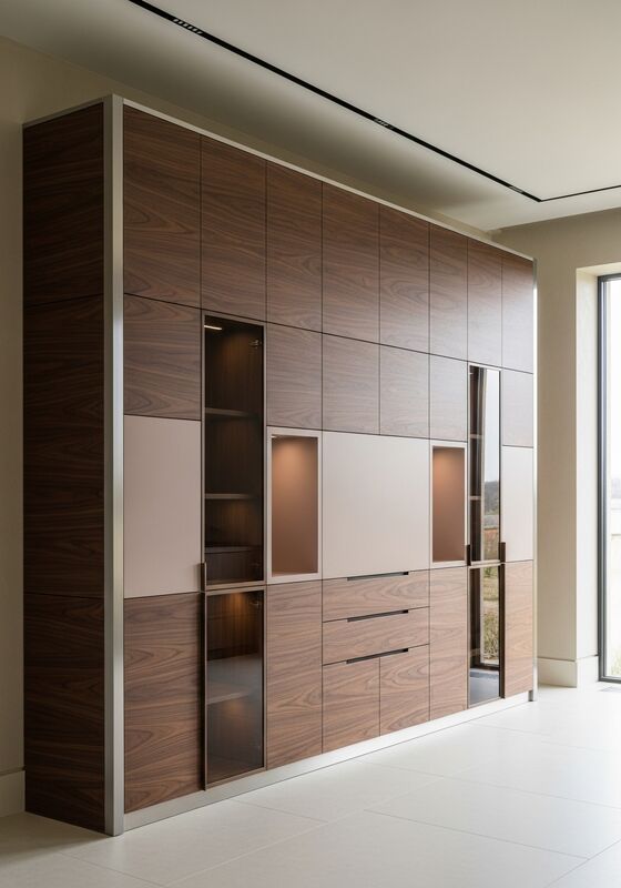 | Material & Performance304 food-grade stainless steel substructure with American walnut wood-grain laminate facing, bronze-tinted smoked float glass modules, matte cashmere-tone lacquer accent panels supports moisture resistance, finish stability, and long-term daily use in hotel lobbies and guest room feature walls, residential living room and bedroom statement walls, executive office reception areas, luxury retail fitting room environments. That matters when buyers need architectural appearance without wood-based maintenance risk. |
