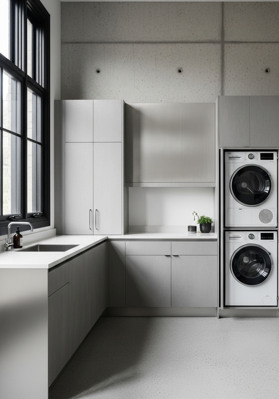 Fadior positions this laundry room cabinet as a project-grade solution built around 304 food-grade stainless steel structural construction; matte grey porcelain stoneware cladding; aluminum hardware in black finish, fine linear grain running horizontal, controlled matte sheen, industrial-precise, and a honed quartz utility surface top for residential laundry rooms, utility spaces, mudrooms, service areas in high-end apartments and homes. This specification focuses on Brushed 304 stainless steel body with horizontal linear grain finish, Matte grey porcelain stoneware tall unit fronts with 3mm micro-texture so designers, dealers, and project buyers can evaluate fit, finish, and delivery logic with less guesswork.