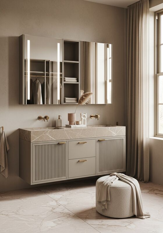 Fadior, bu banyo lavabo dolabını, mat taupe toz boya kaplamalı 304 gıda sınıfı paslanmaz çelik yapısal sistem, mat taupe lake kaplamalı çelik tabanlı gardırop panelleri ve honlanmış mermer veya sinterlenmiş taş tezgah ile proje sınıfı bir çözüm olarak konumlandırıyor. Yüksek kaliteli konutlar, butik oteller ve spa esintili sağlıklı yaşam alanları için ana banyo lavabo depolama alanında ton sıcaklığı ve üstün dayanıklılık arayanlar için. Bu spesifikasyon, tasarımcıların, bayilerin ve proje alıcılarının tahminleri azaltarak uyum, bitiş ve teslimat mantığını değerlendirebilmeleri için 15 mm aralıklı dikey mikro yivli panel kapaklara, sıcak mantar rengi taupe lake kaplamaya ve saten 5 mm profilli Şampanya altın PVD kaplamalı paslanmaz çelik çerçeve kenarlarına odaklanıyor.