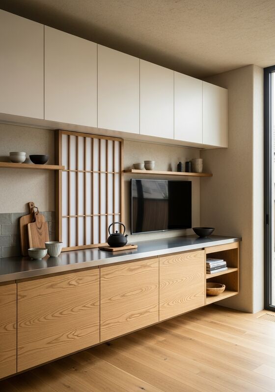 | Tasarım ÖzellikleriWabi-sabi malzeme sıcaklığı ile kısıtlı Japandi minimalizmi, düz taneli meşe egemenliği, sıcak beyaz gerileme elemanları, ince koyu yapısal aksanlar,doğal meşe balı ile yumuşak yayılmış aydınlatma entegrasyon yönü (birincil), sıcak parşömen beyaz (ikinci yüzeyler), siyah demir (yapı aksanı), sıcak kil gri (eleğe bağlı seramik aksesuar rafı), disiplinli oranlar,ve 304 paslanmaz çelik yapı çekirdeğinde doğal Japon meşe kaplama. Sayfa genel bir depolama kutusu değil, çözülmüş bir özellik olarak okunmalıdır. |